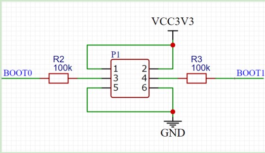 BOOT電路如圖6所示。在單片機上電或復位后,啟動方式有三種:內部FLASH(主閃存存儲器)啟動、內部SRAM啟動、系統存儲器啟動。