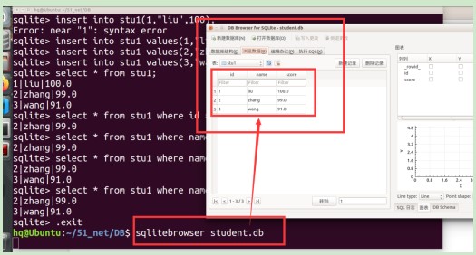 SQLite支持SQL命令,例如CREATE創建,INSERT插入,SELECT查詢,UPDATE更新,DELETE刪除等,其SQL命令可以在SQLite軟件中使用,如圖1-3以Linux系統所示: