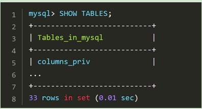 MYSQL數據庫含有很多的MYSQL命令,比如‘SHOW DATABASES;’列出所有可用數據庫,‘USE your_database;’選擇數據庫,‘SHOW TABLES;’列出可用的所有表等等,如圖2-2所示: