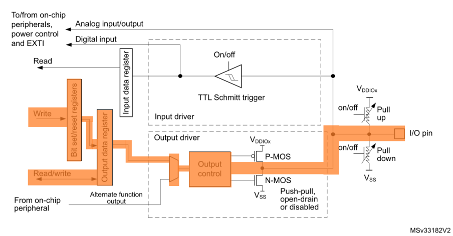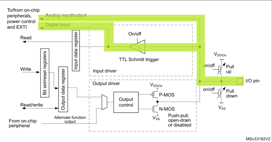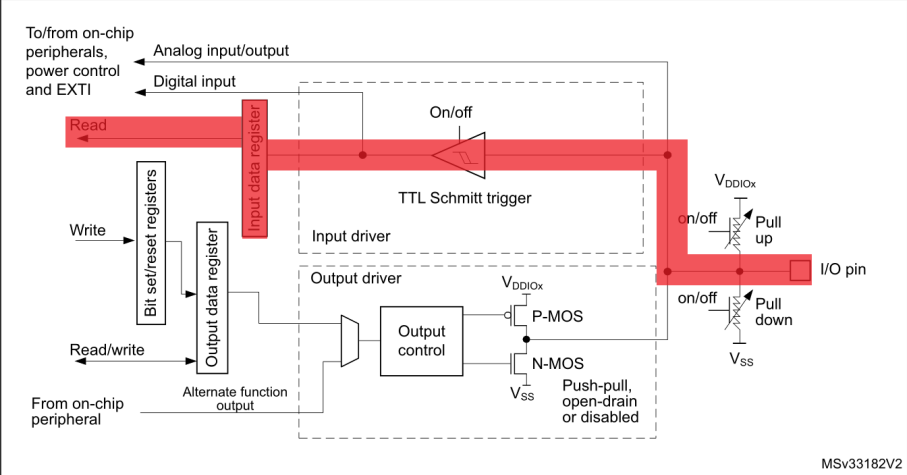 以STM32為例,可在硬件手冊中查看到GPIO中關于I/O端口位的基本結構圖。從圖中可以看出GPIO大致有3種功能:輸入(Read)、輸出(Write)和其他(To/from on-chip peripherals,power control and EXIT)。我們就從這3種功能入手來學習GPIO的應用。如下: