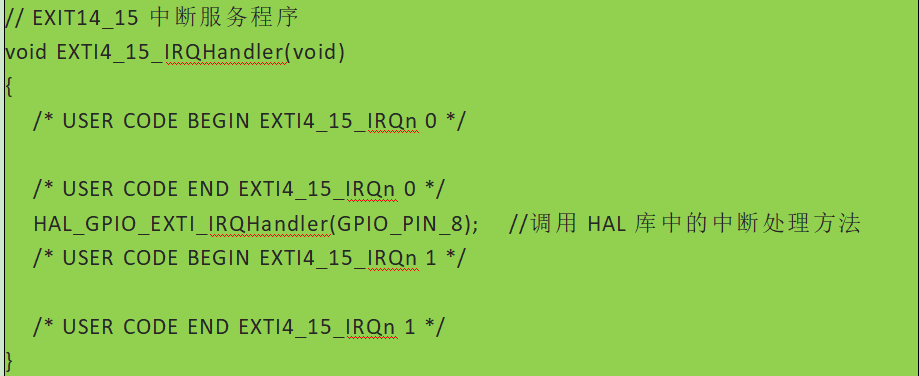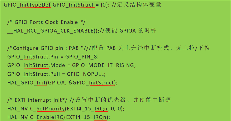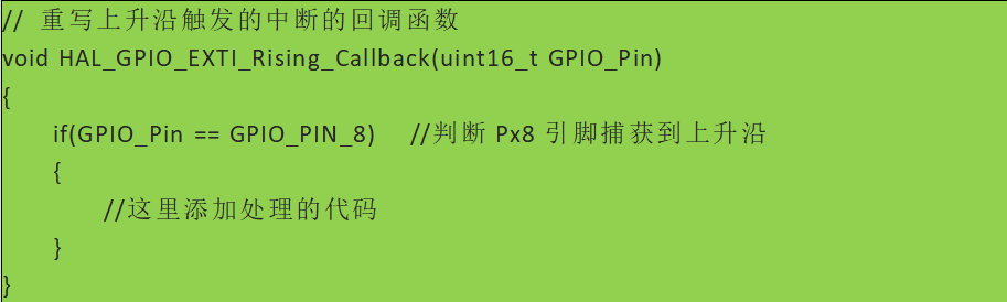 在EXIT中斷模式下,在中斷觸發時系統會自動調用中斷服務程序。中斷服務程序中會默認使用HAL庫的API去處理中斷。為了讓開發人員能自定義處理功能,在HAL中留出允許開發人員重寫的回調函數API。以下是一個對應PA8引腳的上升沿中斷模式開發代碼: