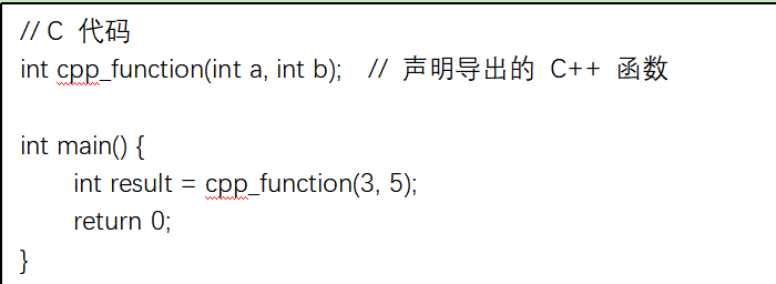 當 C 項目需要使用 C++ 編寫的代碼時,C 語言的編譯器無法直接解析 C++ 的符號。此時需要通過 extern "C" 導出 C++ 的函數或變量,使其符號符合 C 的規則。例如: