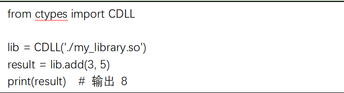 通過這種封裝,動態庫可以被其他語言調用,例如使用 Python 的 ctypes 加載該庫: