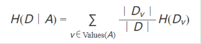 其中,H(D∣A)是在特征 A 的條件下的條件熵,Values(A)是特征 A 的所有取值,DvDv是 在特征 A的取值 v上的數(shù)據(jù)子集,∣Dv∣和 ∣D∣分別是數(shù)據(jù)子集 Dv和數(shù)據(jù)集 D的大 小。