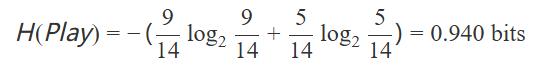首先,我們計算整個數(shù)據(jù)集的信息熵(原始狀態(tài)的信息量):數(shù)據(jù)集包含14個實例,其中9個正例(yes)和5個負(fù)例(no)。