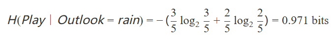 3. 對于Outlook=rain,有5個實例,其中3個正例和2個負(fù)例: