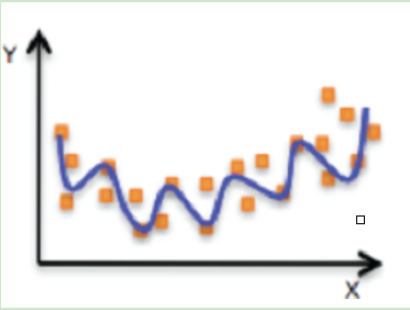 下圖是過擬合的例子,曲線很好的擬合了樣本,跟樣本非常重疊,同樣樣本中的噪聲數據也被擬合了,噪音數據影響了模型訓練。