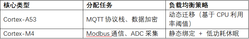以工業(yè)邊緣網(wǎng)關(guān)為例,Zephyr在異構(gòu)多核(Cortex-A53 + Cortex-M4)上的任務(wù)分配示例如下: