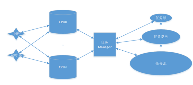 CPU通過(guò)激勵(lì)源上下文和任務(wù)Manager,在任務(wù)隊(duì)列中獲取和占據(jù)合適任務(wù),完成后釋放;