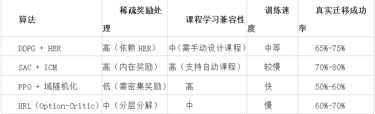 針對機器人抓取的稀疏獎勵問題,內在獎勵引導探索與HER增強經驗復用是提升樣本效率的核心;結合漸進式課程學習與域隨機化,可顯著提高策略魯棒性與跨域遷移能力。實際部署中需權衡訓練速度與穩定性,選擇DDPG+HER或SAC+ICM等組合,并通過并行化加速迭代。未來,隨著自動課程生成與多模態感知的融合,RL在復雜抓取任務中將進一步逼近人類水平。