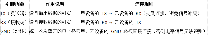 UART 是 “點對點” 通信(不支持多設備共享總線),核心需 3 根線(全雙工,即收發可同時進行):
