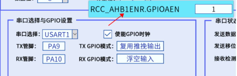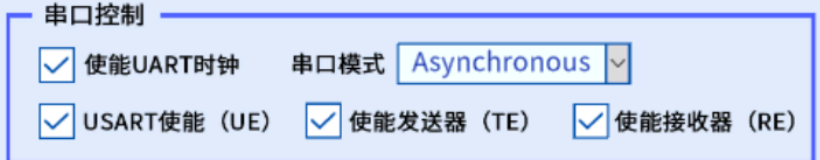 在串口控制中需要依次將“使能UART時鐘”、“USART使能(UE)”、“使能發送器(TE)”、“使能接收器(RE)”勾選上,串口模式選擇“Asynchronous”。