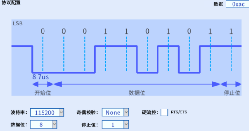 在協議配置中設置波特率為“115200”、數據位“8位”、奇偶校驗“None”、停止位“1位”,并且不啟用硬流控。