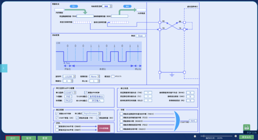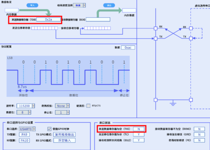 在虛擬仿真系統中,模擬了一個虛擬透傳串口,數據流向的基本過程為,UART控制器給虛擬透傳串口發送數據,然后透傳串口將接收到的數據,再發送給UART控制器,所以UART會接收到同樣的數據。點擊“寫入”,將內存中的數據寫入到發送數據寄存器(TDR)中,當數據從內存寫入到發送數據寄存器(TDR)之后,TDR中的數據會自動并行傳輸到發送位移寄存器中,然后數據會通過發送位移寄存器,按照LSB的方式將數據一位一位的從Tx引腳移出