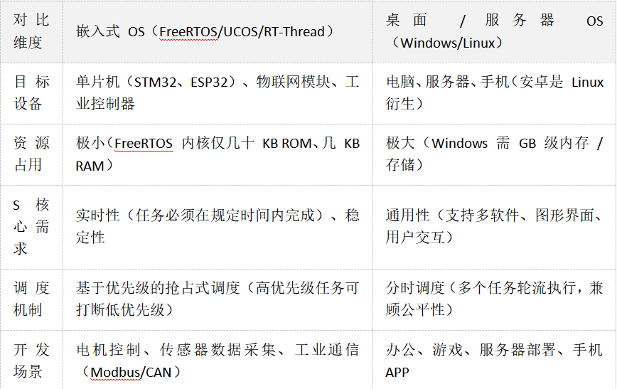 二、嵌入式 OS vs 我們熟悉的 Windows/Linux(桌面 / 服務器 OS)