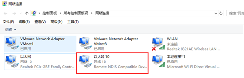 打開(kāi)控制面板的網(wǎng)絡(luò)連接界面,在使用USBmini線連接開(kāi)發(fā)板和PC后可以在網(wǎng)絡(luò)連接界面可看到多了一個(gè)Remote NDIS網(wǎng)卡,如下圖。