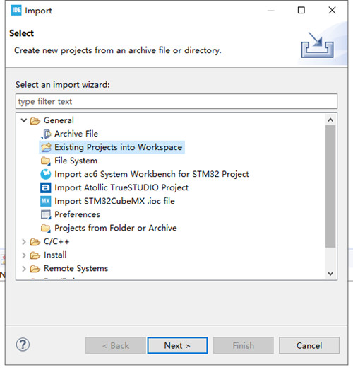 點(diǎn)擊File->Import…,選擇Existing Projects into Workspace,點(diǎn)擊NEXT。