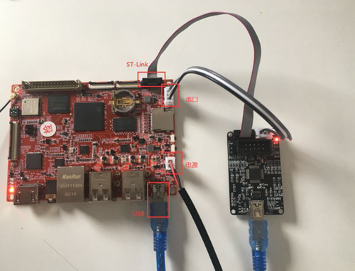 開(kāi)發(fā)板上電,并如下圖連接開(kāi)發(fā)板USB和ST-Link至PC。