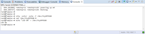在一個(gè)ttyRPMSG0通道上發(fā)送消息”LED ON”或”LED OFF”可控制開(kāi)發(fā)板上LED燈點(diǎn)滅狀態(tài),并在同一ttyRPMSG0通道上同時(shí)接收回顯