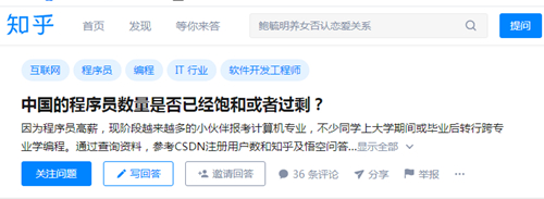 前段時(shí)間,知乎熱搜榜上出現(xiàn)一個(gè)讓程序員聞之色變的問(wèn)題:“中國(guó)程序員數(shù)量是否已經(jīng)飽和或者過(guò)剩?”頓時(shí)網(wǎng)上一片焦慮的聲音。