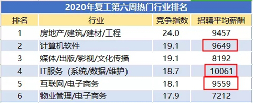 再結(jié)合疫情期間,人工智能、工業(yè)互聯(lián)網(wǎng)、物聯(lián)網(wǎng)、商用5G在發(fā)揮的重大作用,“新基建”熱度持續(xù)提升,直接導(dǎo)致互聯(lián)網(wǎng)技術(shù)人才缺口增大,在高技術(shù)服務(wù)和制造業(yè)領(lǐng)域增長(zhǎng)將尤其明顯。