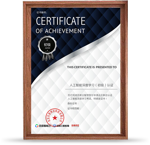 百度是國內較早進入人工智能領域的企業,華清遠見是百度云智學院授權認證合作伙伴。《人工智能深度學習(初級)認證》是百度云智學院與華清遠見聯合打造的深度學習人才培養與認證體系。完成華清遠見人工智能體系課程學習并考試通過,可獲得由百度云智學院頒發的高含金量《人工智能深度學習(初級)認證證書》。